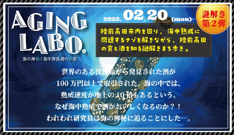 2023年2月20(月)には謎解きゲーム第2弾となる「AGING LABO.海の神秘!海中熟成酒の秘密」をスタートします。こちらは弊社が展開するお酒を海に沈めて味の変化する特性を活かした物販&観光の取組みである海中熟成のストーリーに沿った謎解きとなり、陸前高田の食と酒を楽しみ、知ることができる内容となっております。