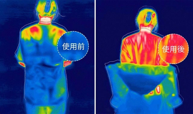 胸元にあるボタンを押すだけの簡単操作。ボタンを押してからたったの1秒で発熱が開始します。発熱シートにはカーボンナノチューブを採用し、遠赤外線を5μm放射。ゲレンデで冷えた身体を暖めます。
