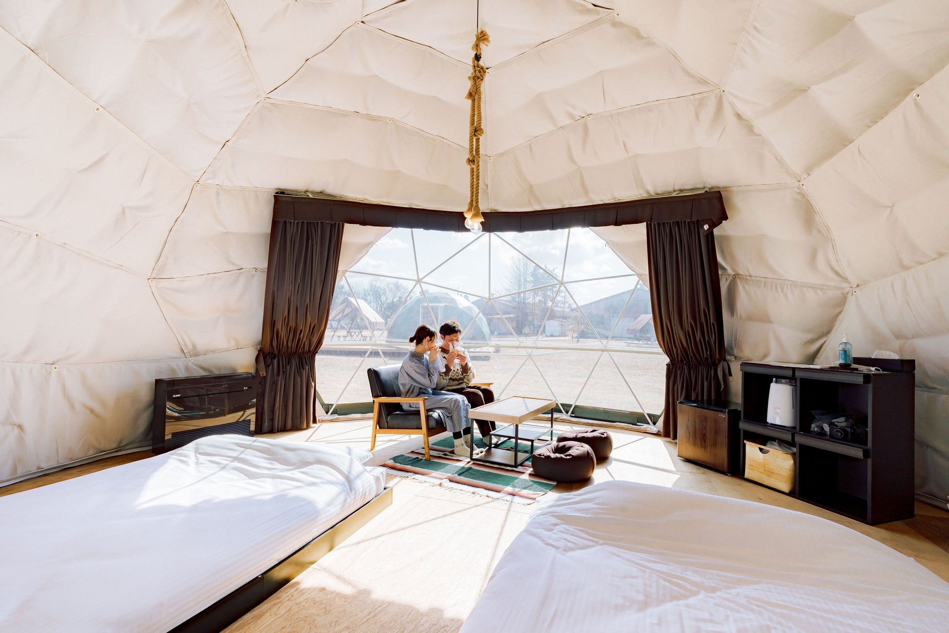 40,000平米の開放的な芝生が広がり、全室冷暖房・ベッドが完備されたテントで快適なグランピングをお楽しみいただけます。
