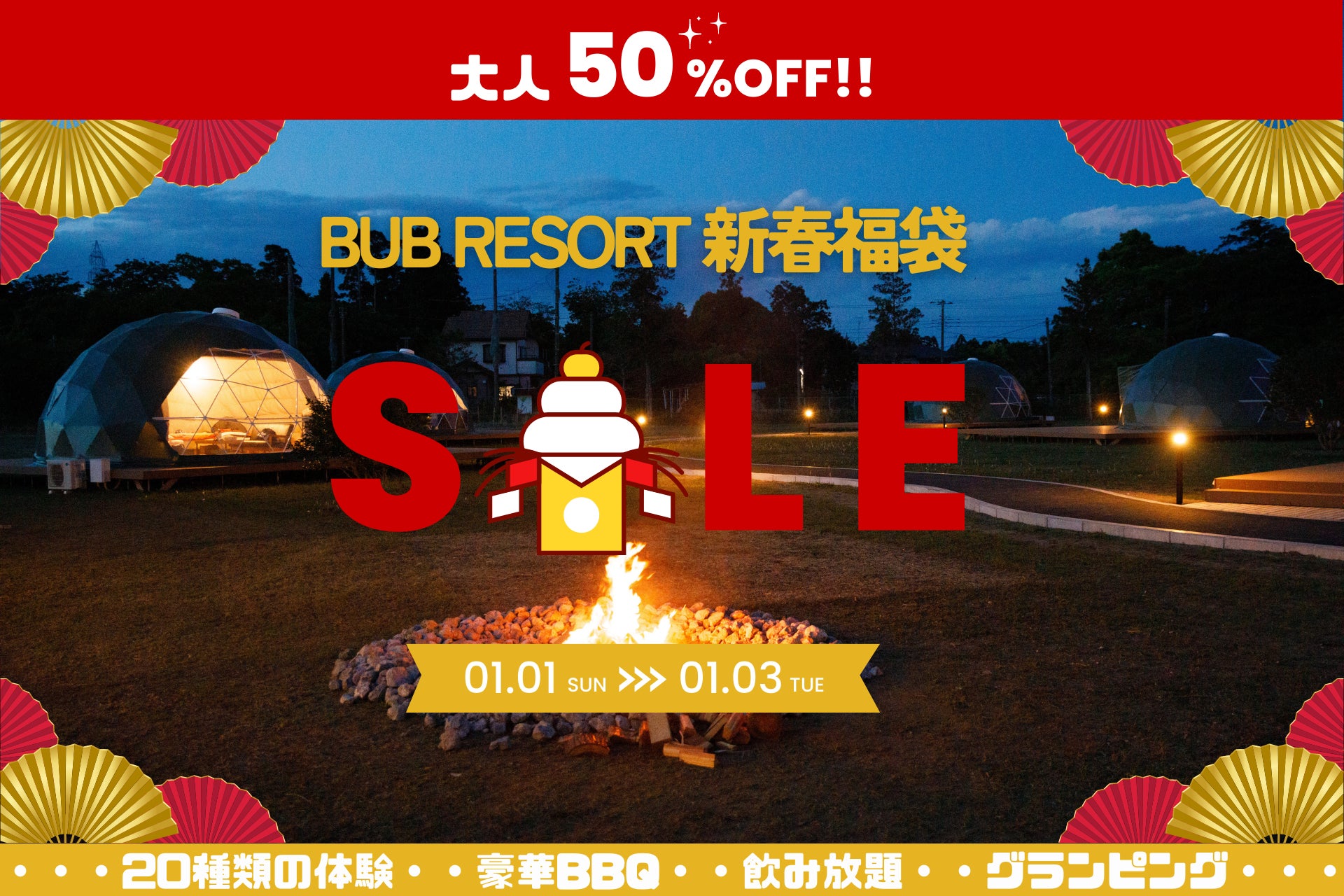 株式会社BUB(東京都品川区、代表取締役 一戸 悠人)が運営するBUB RESORT Chosei Village(千葉県長生郡)で本日から三日間限定で、料金が半額(子供料金除く)となる福袋プランを販売いたします。2023年1月1日~3日の期間中に、対象期間(1月13日~2月28日)のご予約いただいた方が対象となります。
