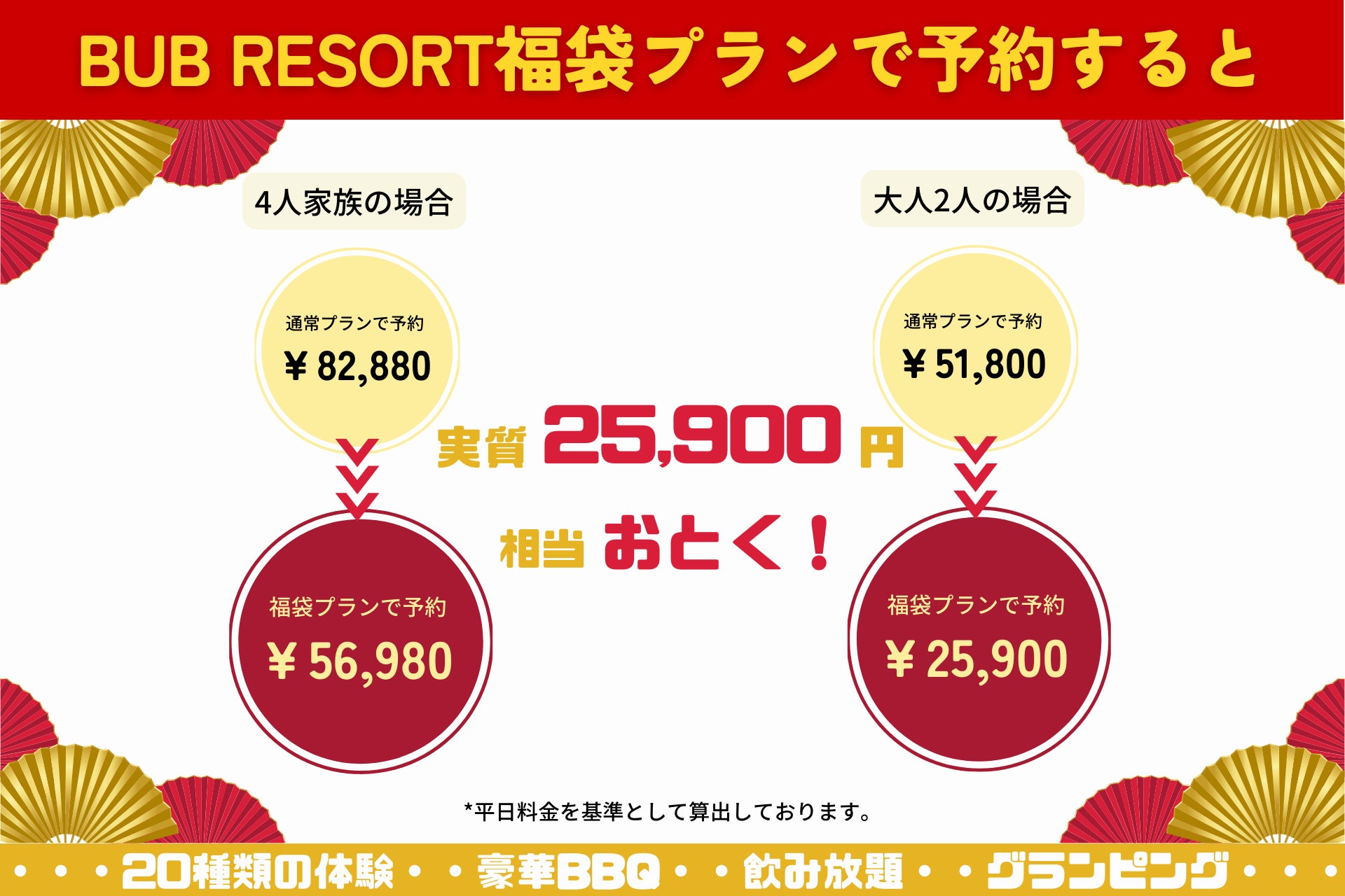 BUB RESORTは観光産業と地域を応援するため、去年と継続で大幅な割引キャンペーンを行います。家族でご来場の場合は大人料金半額となっており、大人4人でご来場の場合は全員で最大92,000円お得の割引料金で販売いたします。