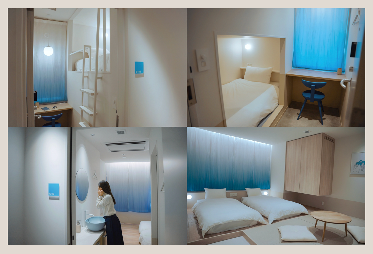 SEKAI HOTEL Takaokaでは“青のまち、高岡”を存分に楽しんでもらうために“やわやわブルー”を合言葉に掲げます。ホテルデザインには至る所に優しい青、柔らかい青を設えております。