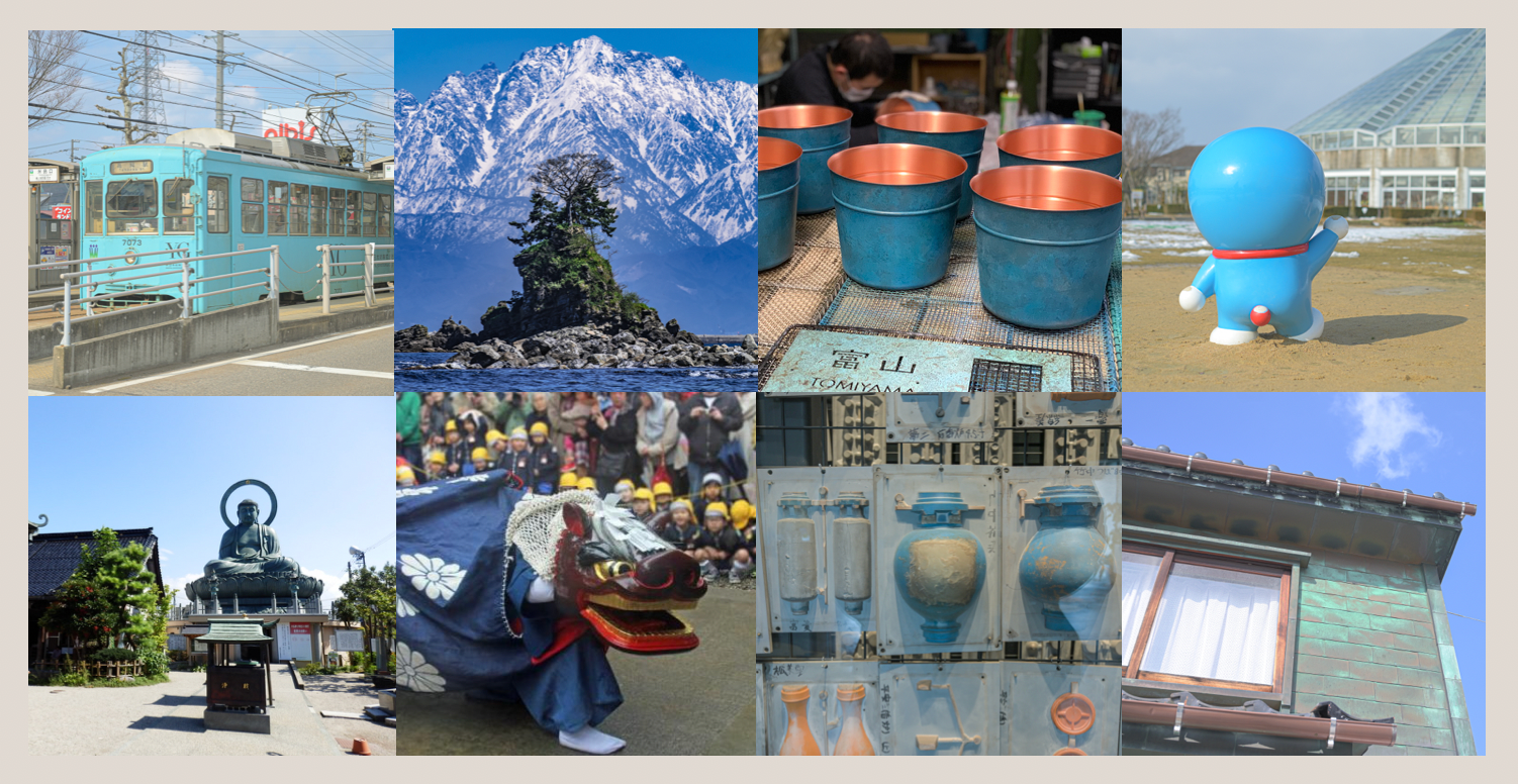 天気の良い日には雄大な立山連峰が望める雨晴海岸。青色の国民的キャラクターや高岡大仏。まちを走るレトロな路面電車や、鮮やかな青に染められた高岡銅器など、多くの魅力的な青と出会うことでしょう。