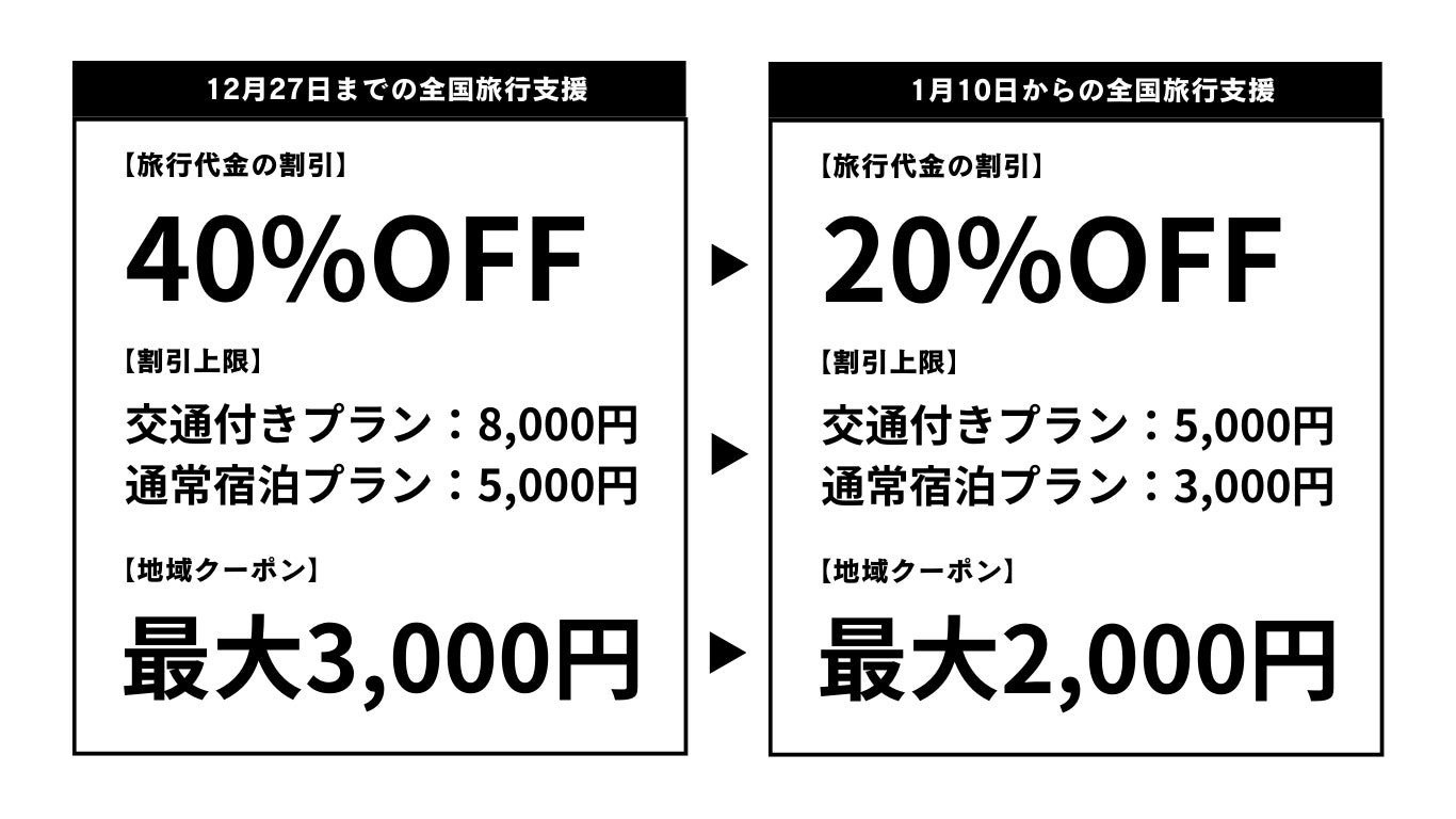 2022年10月11日~12月27日時点の全国旅行支援では旅行代金 最大40%割引でしたが、2023年1月10日(宿泊)からは最大20%の割引に変わります。それに伴い、割引の上限額も変更。交通付き旅行は上限5,000円、その他の旅行は上限3,000円となります。