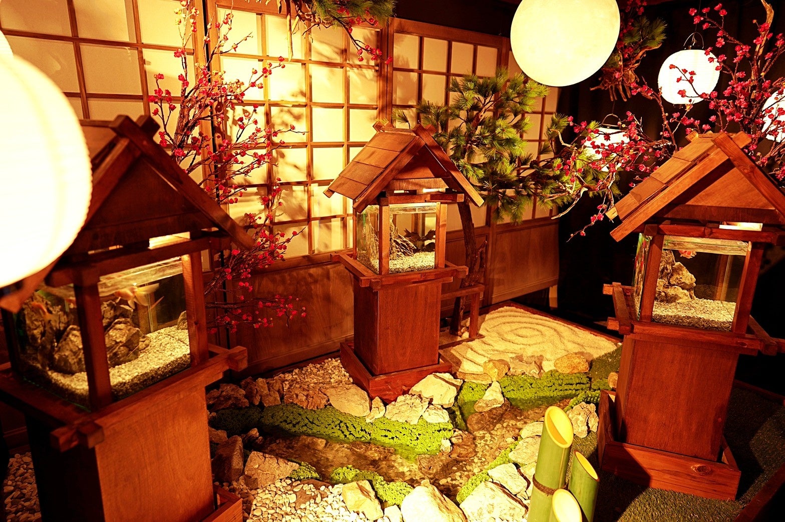 NARA KINGYO MUSEUM(奈良金魚ミュージアム)で初となるお正月イベント「初金魚」。企画展示エリアでは、伝統的な日本庭園をイメージした松竹梅の装飾と灯篭をモチーフにしたオリジナルの水槽から、流れる水に癒しを感じられるように小川を再現しました。