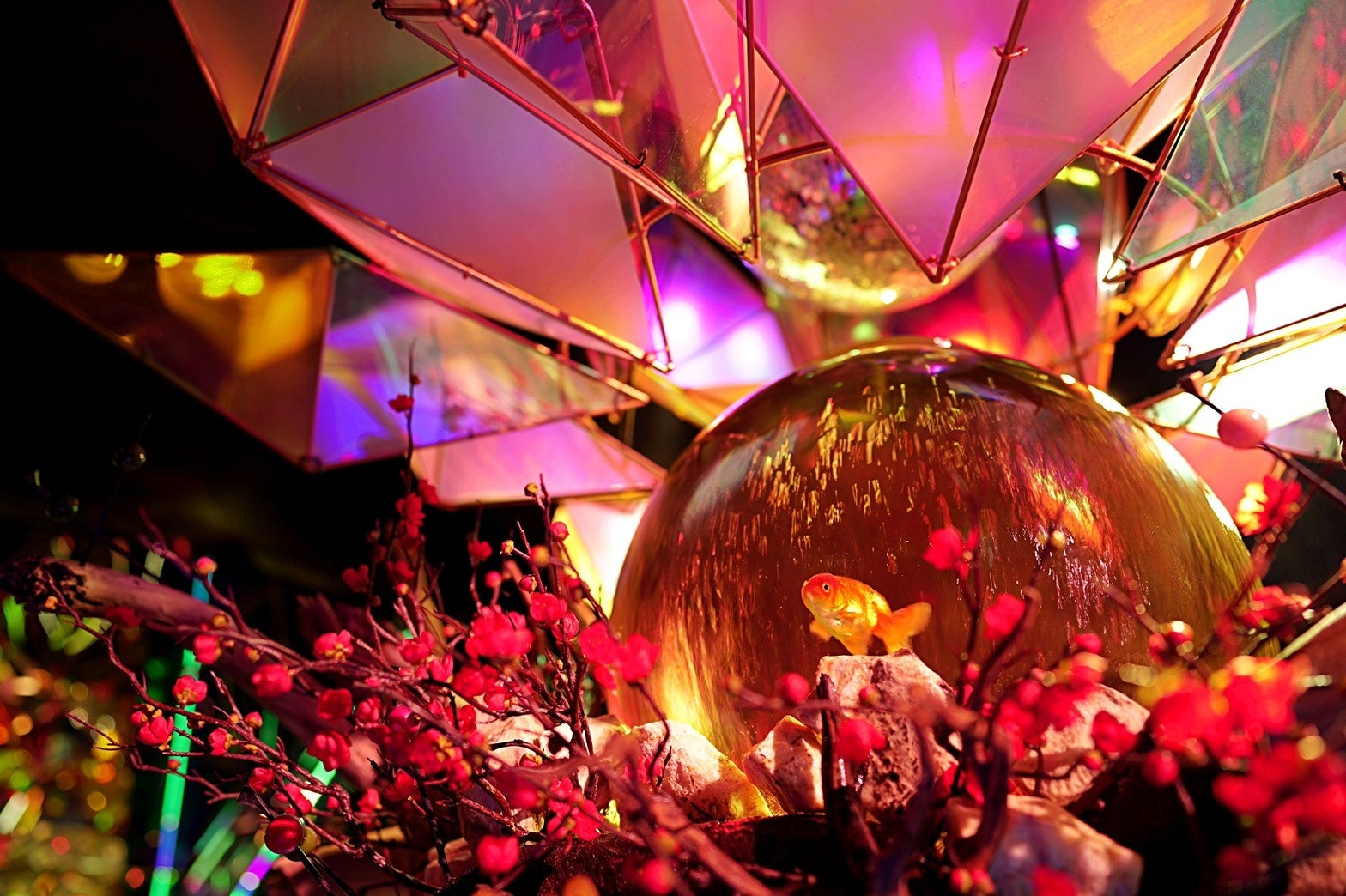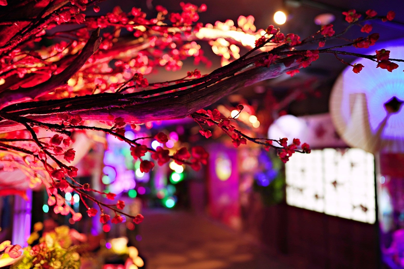 「JAPONE 小路」と「JAPANESE AQUARIUM DISCO」の2つのエリアを松竹梅の造花で彩りました。お正月に相応しく、より一層「和」の雰囲気を感じられる空間となっております。