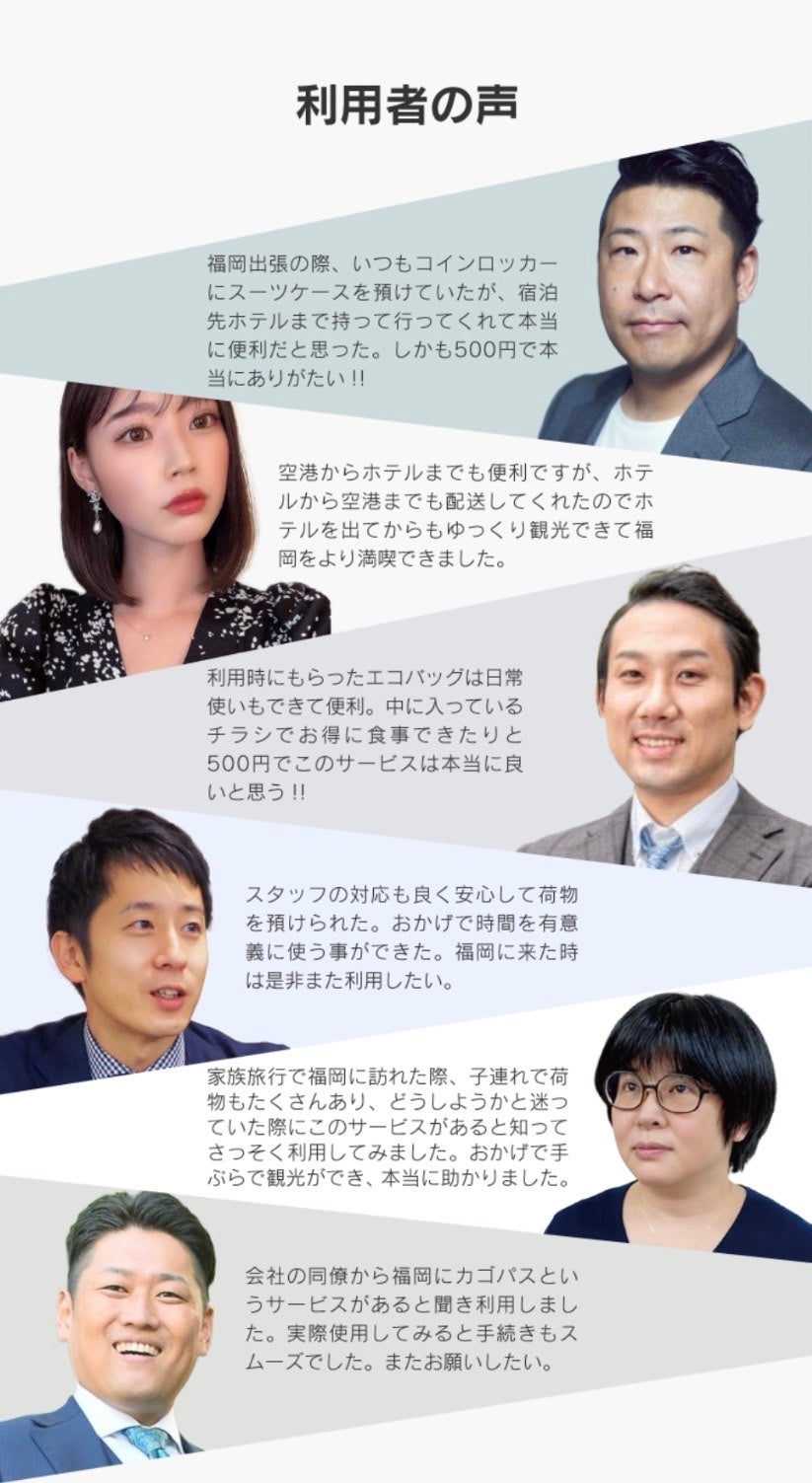 サービス開始から1年弱であるが、福岡市中央区・博多区の配送可能エリア内のホテル提携も順調に伸び、現在190件程のホテルへの配送が可能となっている。また、ホテルから空港への配送可能ホテルは、70件程となっている。(無人ホテル等、一部配送不可ホテル有)