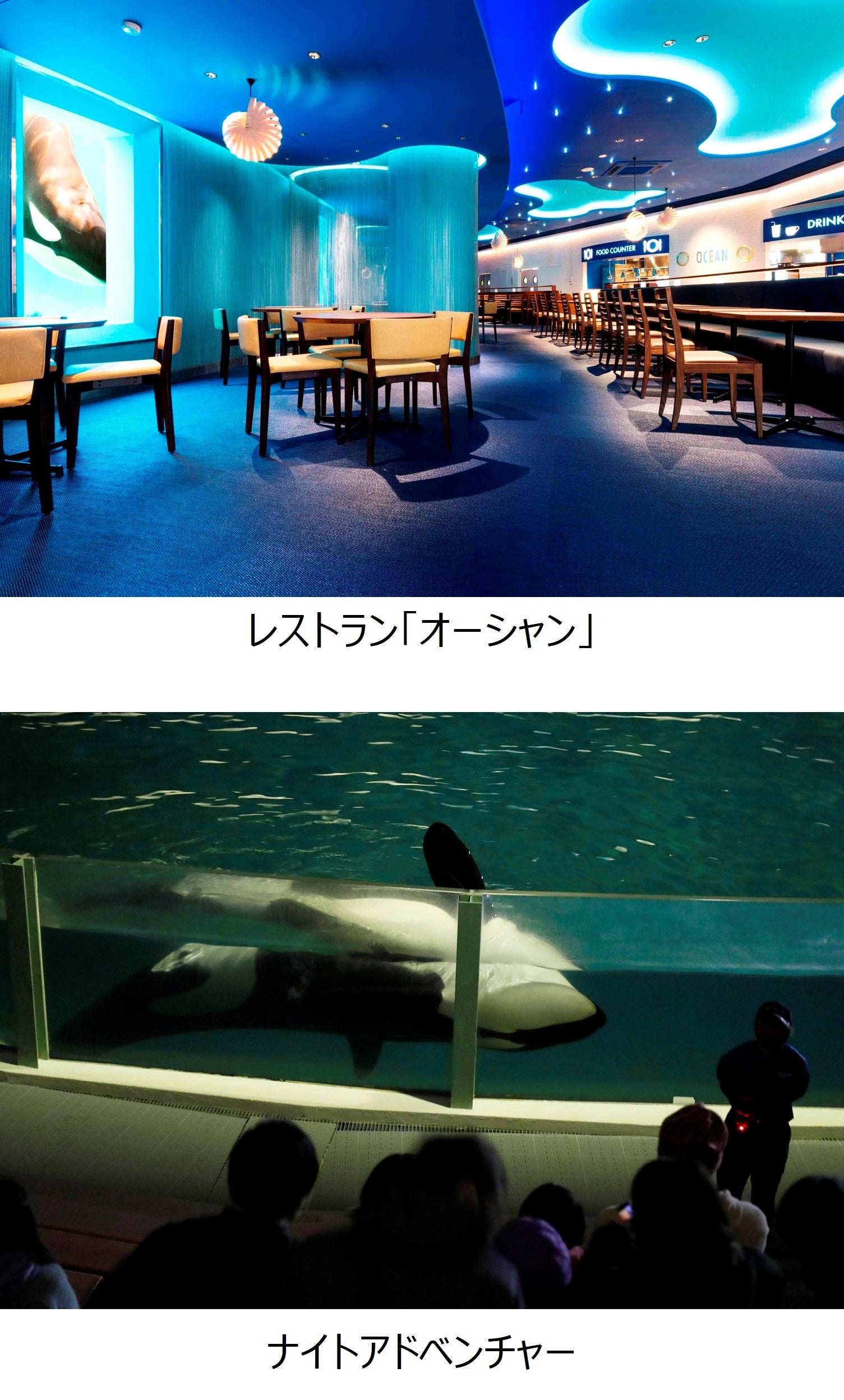 「水族館探検プラン」は閉館間際の16:00からプログラムを始め、閉館後の水族館をゆったりと満喫する特別プログラムです。はじめにシャチの待つオーシャンスタジアムで、ガラス面越しに大きなシャチを間近で見ながら、ひとりずつシャチへの給餌体験を行い、グループごとにシャチとの記念写真を撮影。続いて、トロピカルアイランドの裏側(機械室や飼育スペース)を見学し、シャチのトレーナーによる特別レクチャー「シャチものしり講座」を受講します。その後、日本で唯一シャチが水中を泳ぐ姿を見ながら食事ができるレストラン「オーシャン」で夕食※1を満喫。そしてプランの締めくくりには、飼育員による解説付きの「ナイトアドベンチャー」で、シャチをはじめとした、海の動物たちの寝姿を観察します。