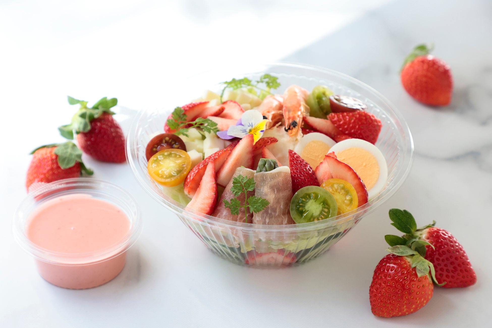 大阪府産いちごの規格外原材料を使用したドレッシングに、フレッシュないちごやモッツアレラチーズなどを加えたシェフオリジナルのサラダです。