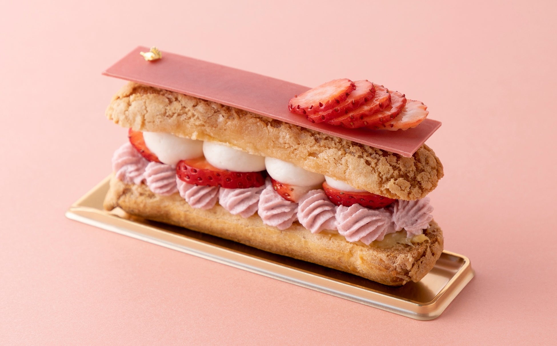 いちごは「紅ほっぺ」を使用。2種のクリームの甘みとジュレの酸味が相性抜群のいちごのエクレア。いちごの板チョコが、可愛らしい見た目だけなく、パリッとした食感のアクセントになっています。
