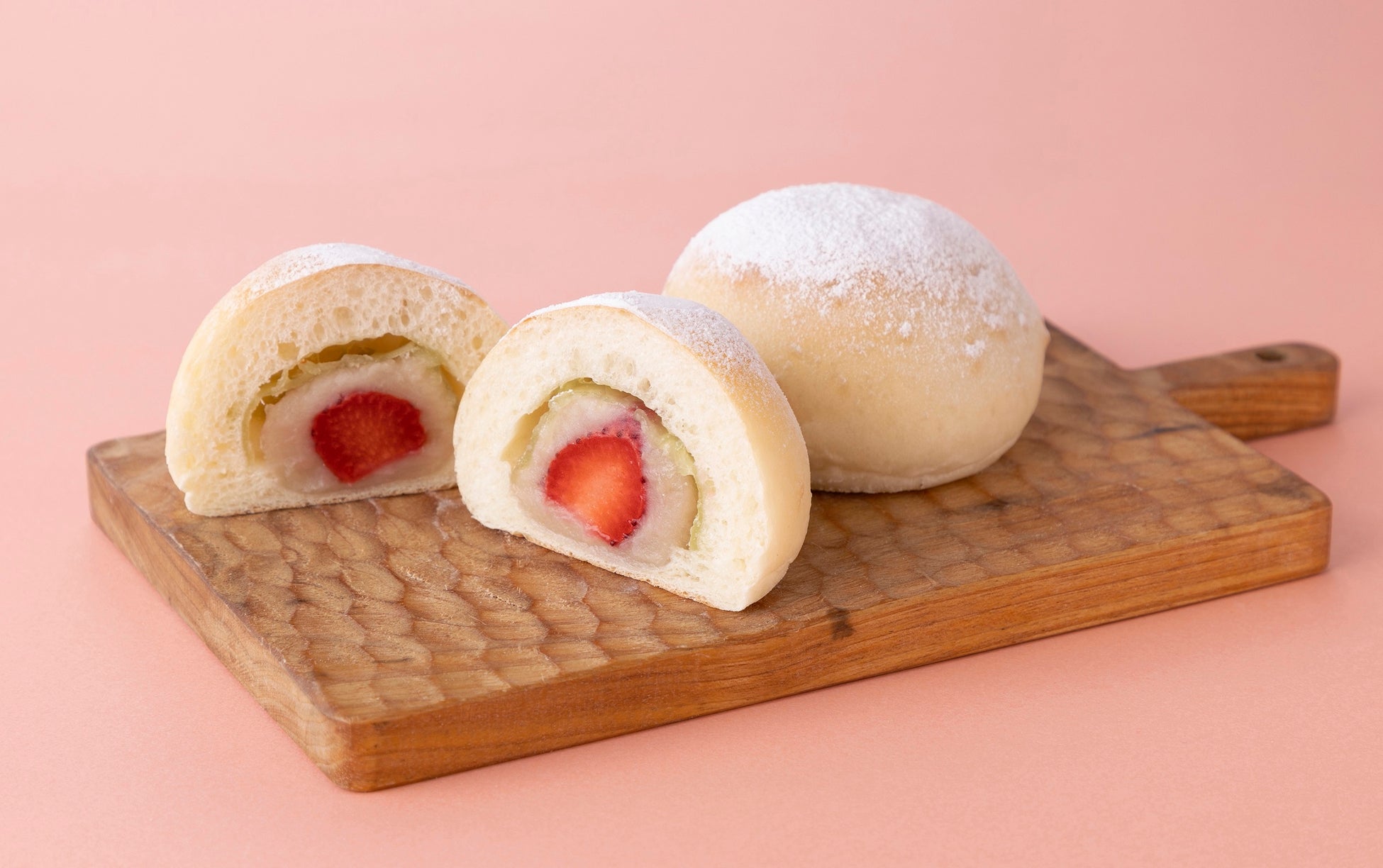 もっちりとした抹茶風味の求肥に、白餡といちごをまるごと1粒閉じ込め、ふわふわの豆腐パン生地で包みました。