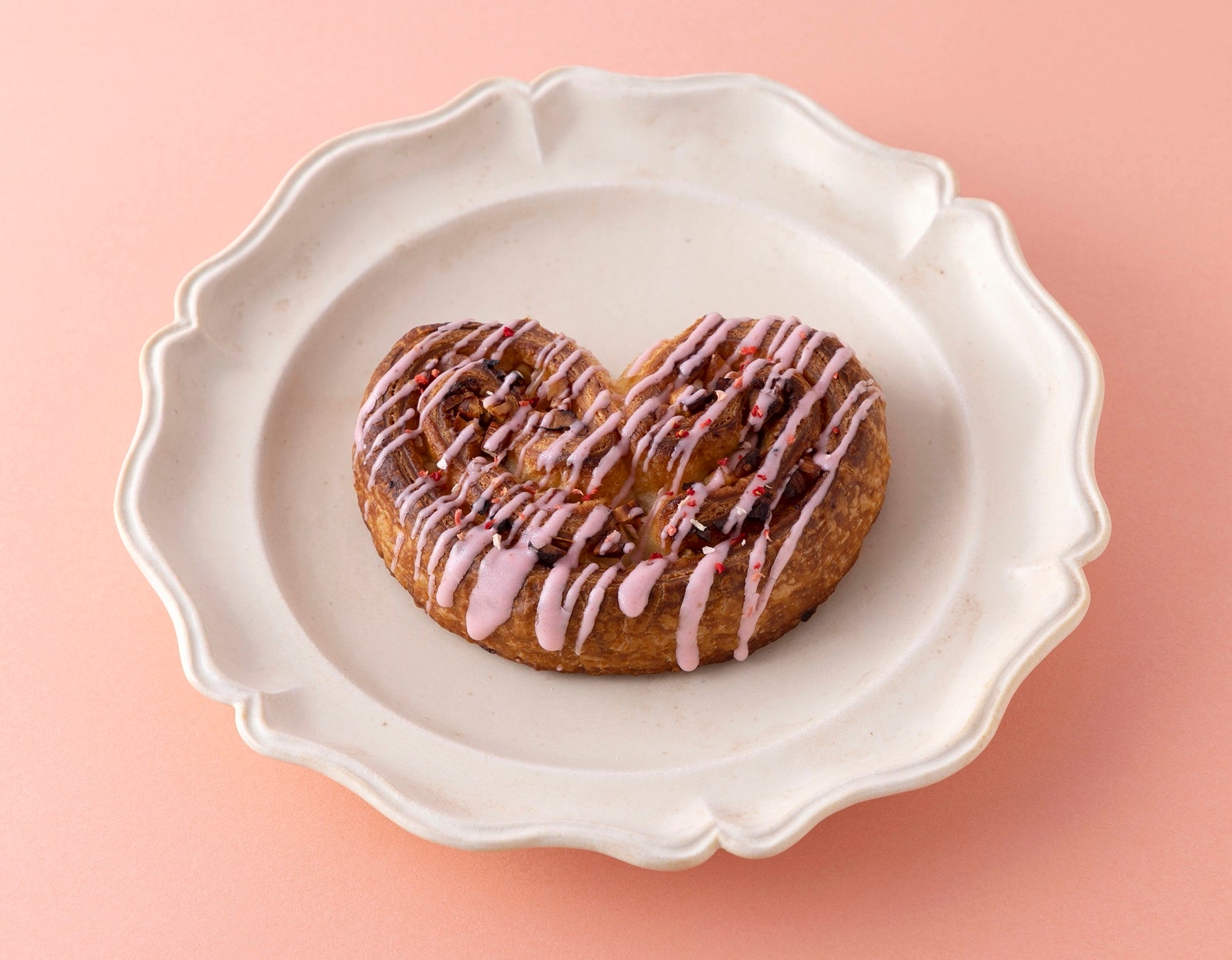3種のナッツを折り込んだ可愛らしいハート型のデニッシュ。いちごチョコレートとドライいちごで華やかにトッピングしました。