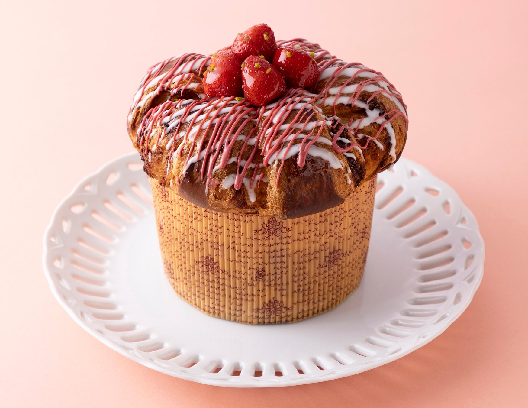 生地にいちご風味のアーモンドクリームといちごのリキュールに漬け込んだドライいちご、いちご風味のダイスチョコレートを練り込んで焼き上げ、いちごのコンポートをトッピングしました。