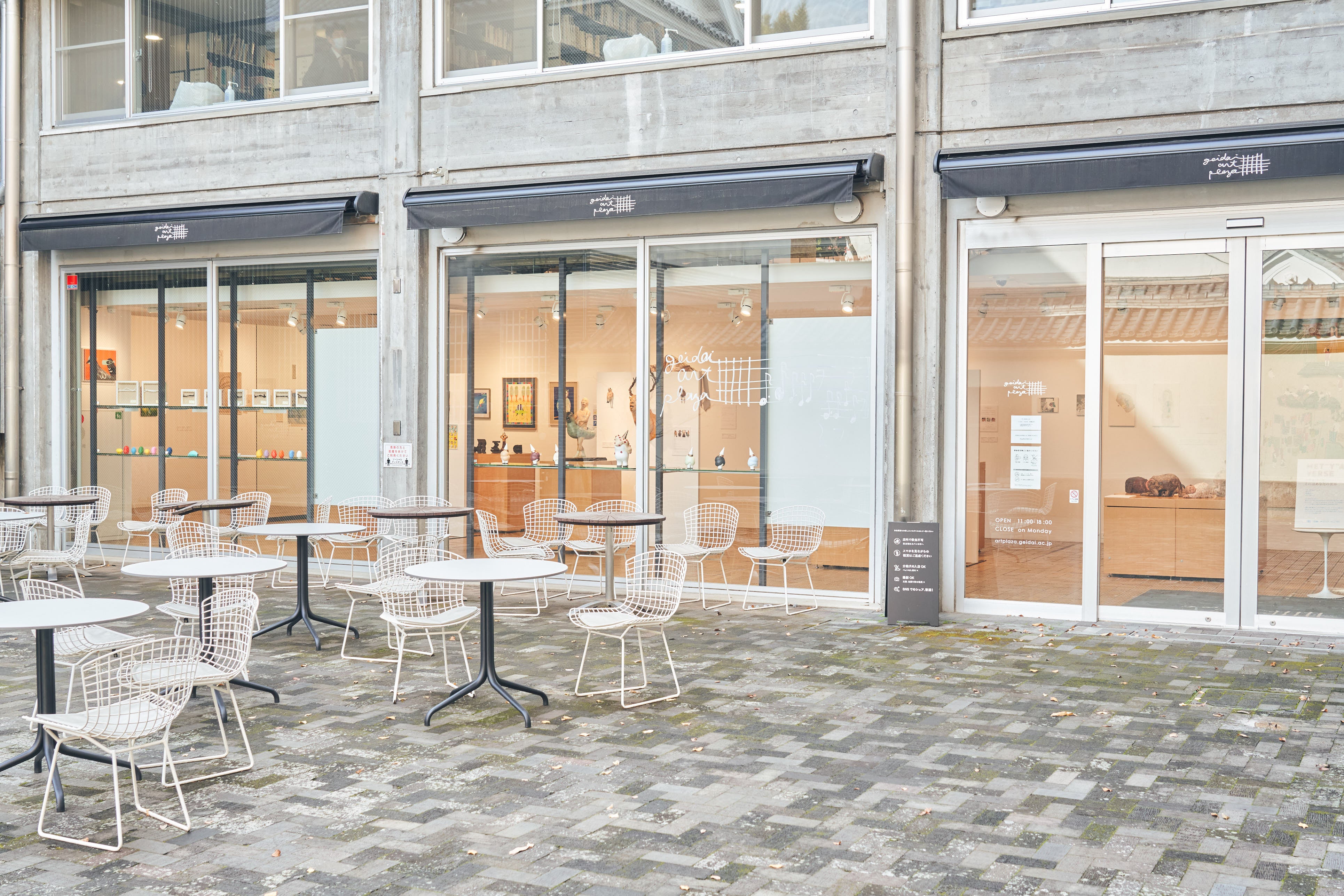 店舗内には、器やアクセサリーを中心とした常設作品コーナー「LIFE WITH ART」、企画展と連動した書棚も設置。店舗の営業時間中は、屋外のキッチンカー「NoM cafe」のカフェドリンクで、一息つくこともできます。