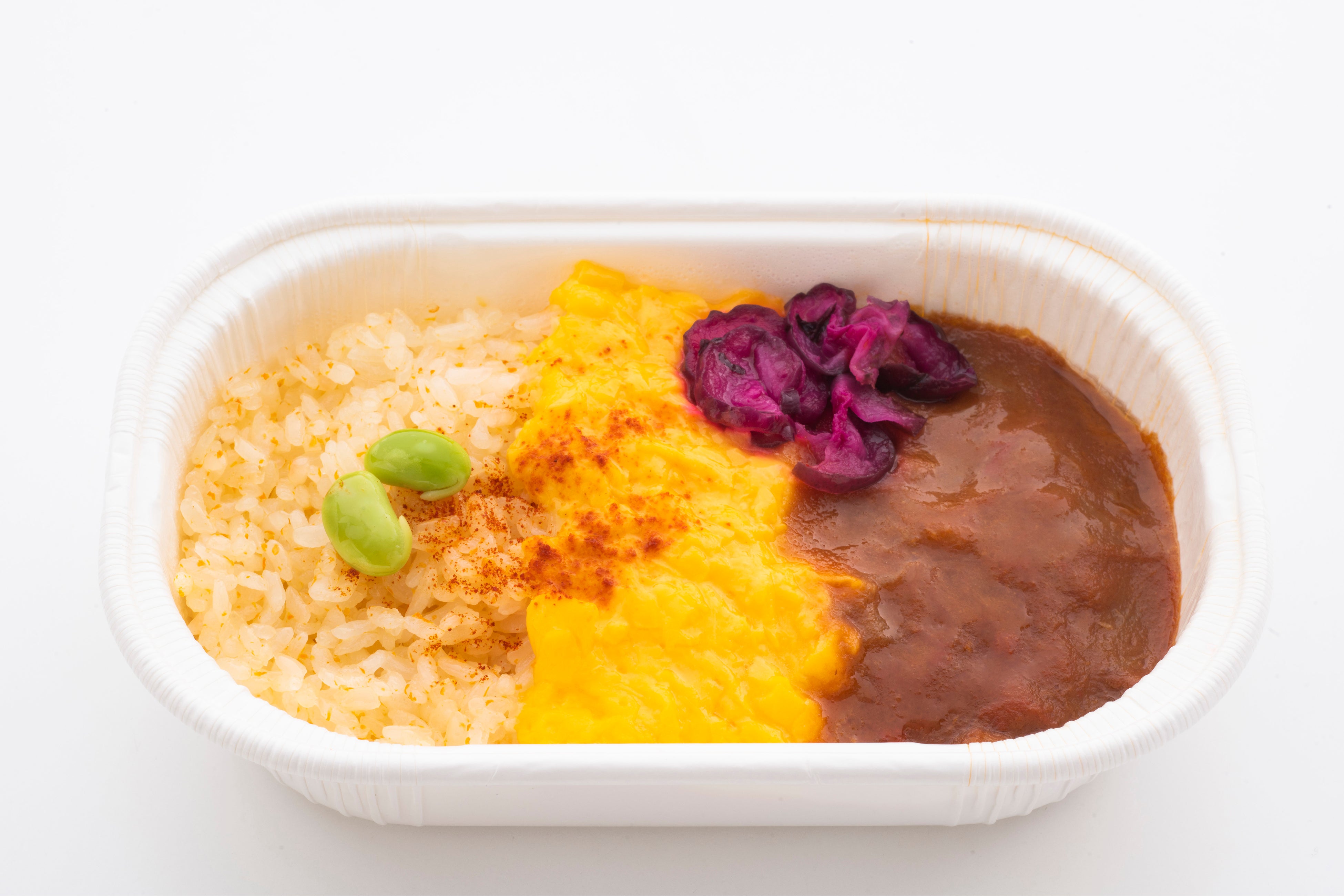 小さなお子さまから大人まで、開けた瞬間、楽しく喜んでいただける よう、二つの人気メニューを組み合わせました。枝豆で食感を、パプリカで色味を、アクセントにはココナッツオイルを使用し、見た目の華やかさと味わいの奥行きを増しています。また、お子さまも美味しく野菜を食べられるよう人参ライスを採用しています。お口直しには、酸味と 食感を感じていただけるしば漬けを添えています。
