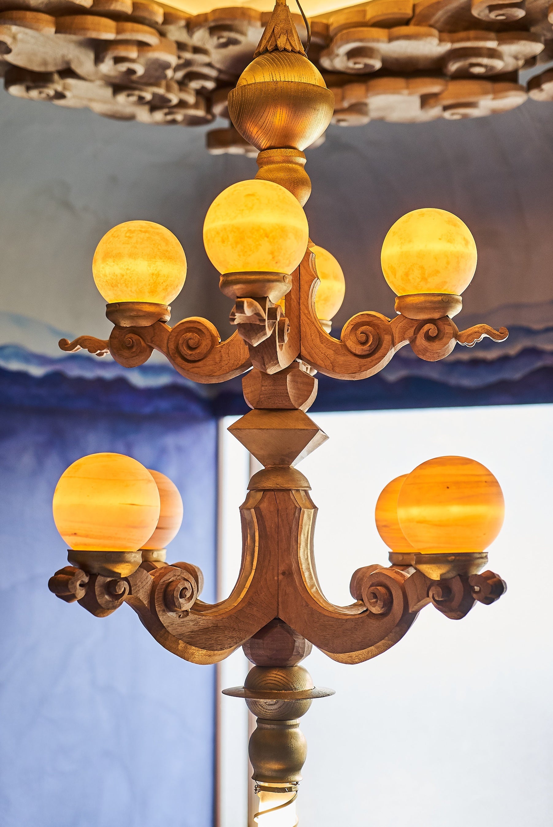 元料亭「金中」の表玄関を抜けると、吹き抜けの天井に吊るされた木彫刻のシャンデリアがゲストを出迎えます。 部屋のさまざまな場所に作品が展示され、滞在を通して井波の歴史を感じられます。前川大地の職人技と 遊び心が、当時の賑わいを想像させてくれる空間です。