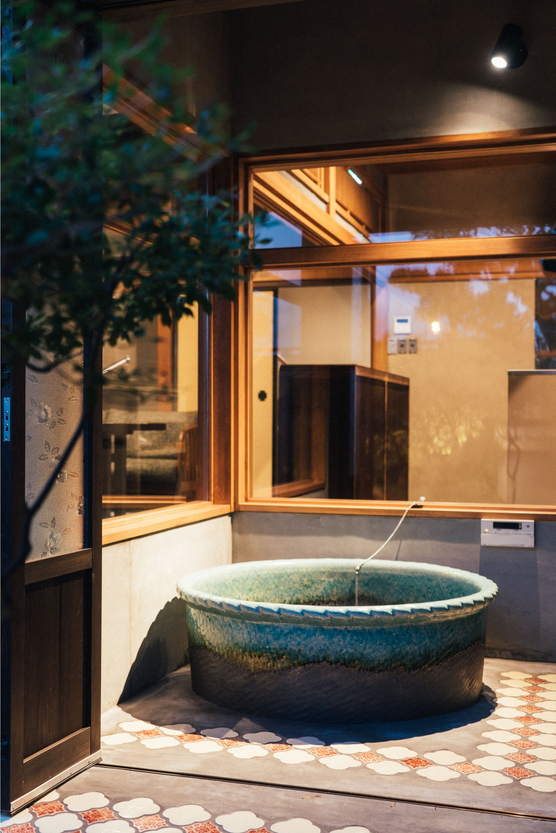 料亭時代、最上級の客間として用いられた和室。鮮やかなタイルが敷き詰められた露天風呂からは、 前川わとの明るい色彩の作品に呼応するように四季折々変化する専用の坪庭の風景を眺められます。ゆったりとした「蜜な」時間を過ごせる客室に仕上がりました。