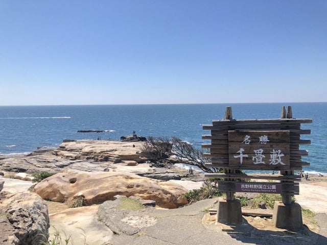 太平洋の青い海を背景に広がる大きな白い岩盤、長い年月をかけて打ち寄せる荒波に浸食され岩だたみのような景観になりました。水平線に沈む夕日はまさに「絶景」です。千畳敷と雄大な太平洋の景色を眺めながらお食事が出来る「海鮮屋千畳」、南紀白浜のお土産が揃う「茜・千畳茶屋」があります。
