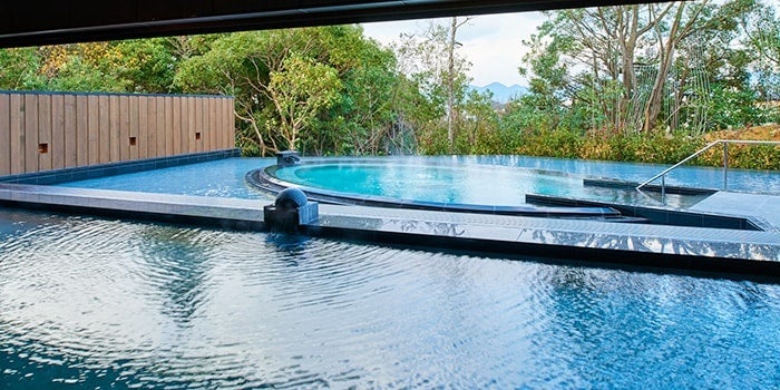 一面に広がる水盤に大きく張り出し、まるで水に浮かんでいるような感覚となる露天風呂。お湯に浸かると心地よい開放感が味わえ、木々の香りと静かな水面に映り込む四季折々の風情が楽しめます。