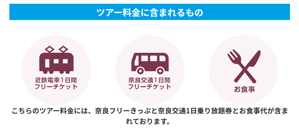 こちらのツアー料金には、大阪・奈良・京都 三都めぐりきっぷ(1日フリー)と対象のお店でのお食事料金が含まれております。
