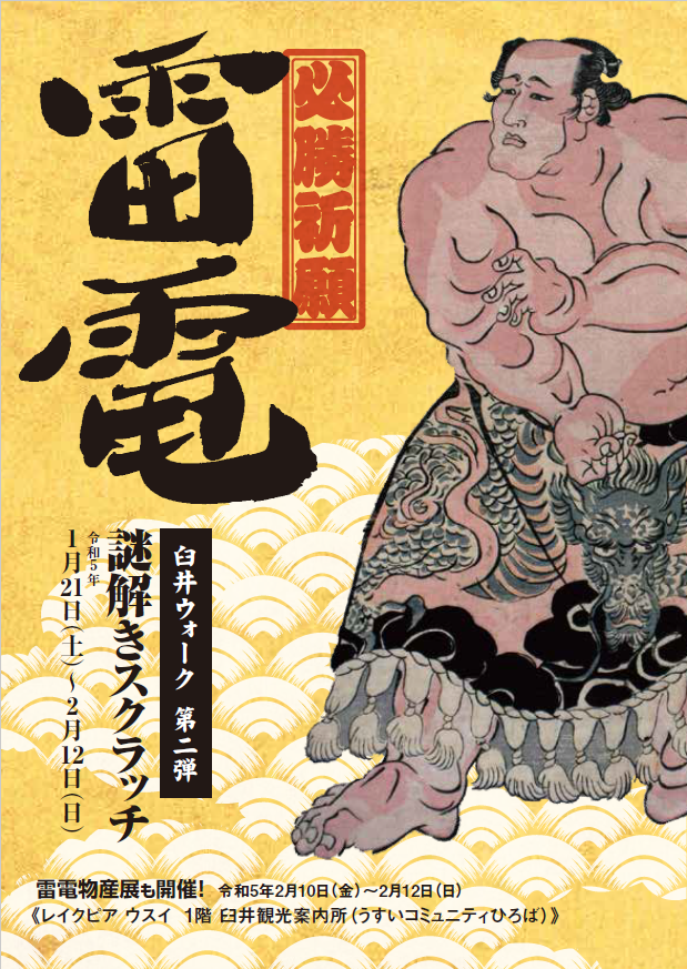 第1弾は、1月21日(土)から、雷電謎解きスクラッチがスタート。雷電終焉の地「臼井(うすい)」に設置された謎解きポイントを巡り、謎を解くと、必勝祈願グッズ(オリジナルクリアファイル)がもらえます。