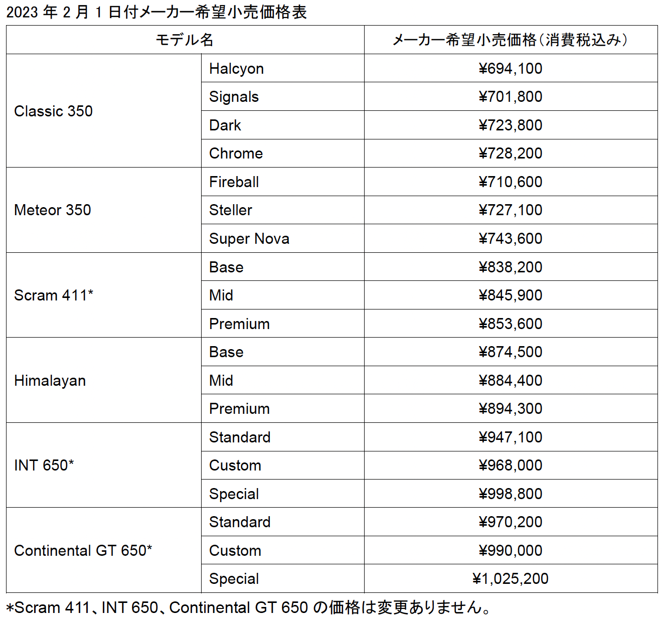 ピーシーアイ株式会社(代表取締役社長:高橋一穂)は、2023年2月1日以降に販売される ロイヤルエンフィールド車の車両価格を改定いたします。