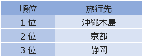 旅先としては沖縄本島が最も多く、続いて京都、3位は人気再熱の熱海やキャンプ需要の高まりから静岡がランクインしました。