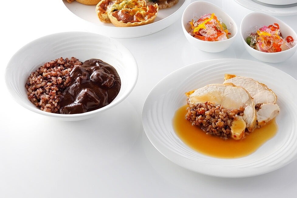 岩手県軽米町のあわ、ひえ、いなきび、たかきび、アマランサス、緑米、赤米、黒米などの雑穀をホテルオリジナルブレンドにした「Jシリアル」は、食物繊維やたんぱく質、ビタミン、ミネラル、ポリフェノールなどの栄養価たっぷり含みます。ニューオータニ特製カレーやJシリアルの丸ごとローストチキン(ランチのみ)でお愉しみいただけます。