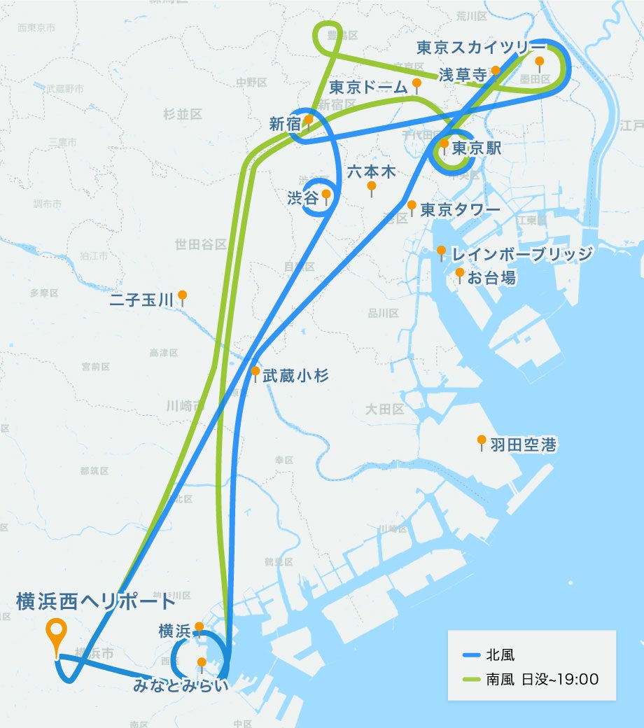 昼:東京ヘリポート 夜:横浜西ヘリポート |