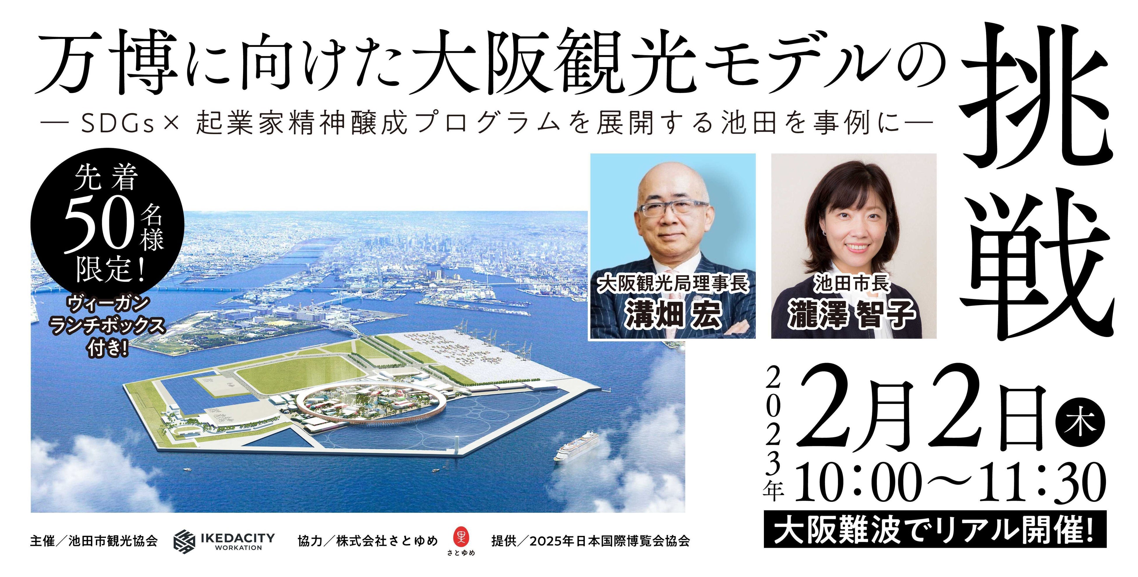 全国各地で地域活性化やビジネス創出を支援する株式会社さとゆめ(本社:東京都千代田区、代表取締役社長:嶋田俊平、以下「さとゆめ」)は、大阪府池田市観光協会とともに、企業向けワーケーションプログラムの策定・展開を行っています。このたび、2022年後半よりインバウンドを含めた観光需要が回復の兆しを見せている状況を踏まえ、2025年の万博を見据えた大阪の新たな観光モデルおよび池田市のワーケーションを紹介する“リアル”セミナーを開催します。大阪観光局と大阪府池田市の両トップに登壇・解説いただきますので、メディアおよび観光事業者の方々、企業向けワーケーションに関心がある企業のご担当者様はぜひお越しください!参加者には無料でヴィーガンランチボックスをプレゼントいたします。