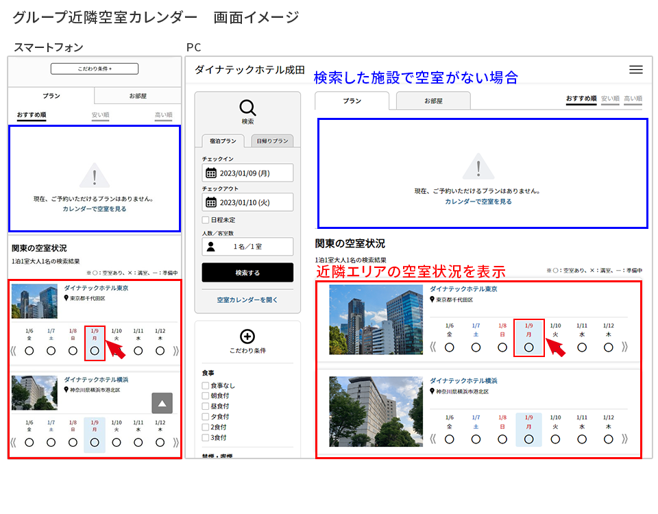 「グループ近隣空室カレンダー」では、検索した施設で空室がない場合、グループ内の近隣施設の空室状況を自動でカレンダー表示します。予約者様は近隣で宿泊できる施設を調べ直す手間が省けるため、スピーディーに予約できます。また、宿泊施設様はグループ内での予約の取りこぼしを防ぐことが可能です。特定の施設で空室がない場合でも、予約の離脱防止をし、グループのメリットを活かせる機能となっています。