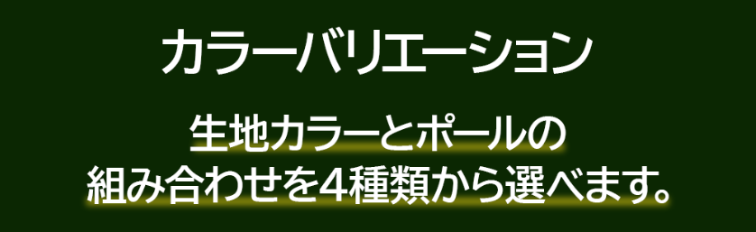 王道であるブラックのポールは、どちらの生地と組み合わせても締まった印象を与え、シャンパンゴールドはオリジナリティがありながら、アウトドアに溶け込む絶妙な配色に仕上げました。
