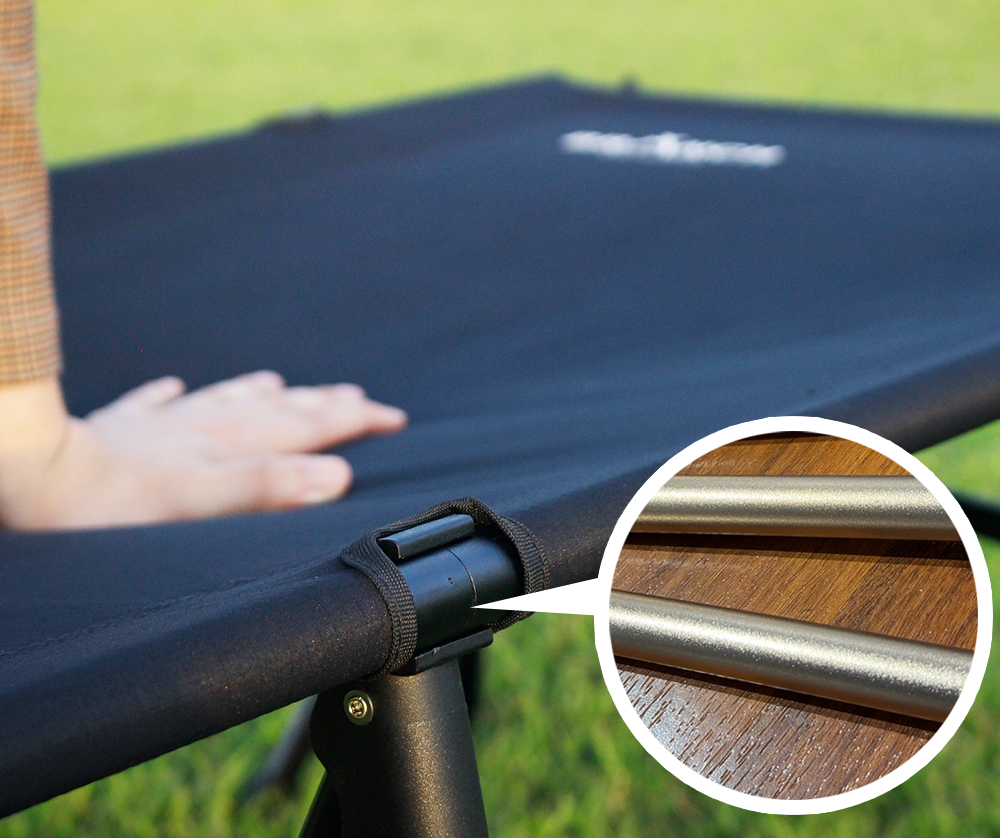 さらにフレームにザラザラした質感の特殊塗装を施すことで、生地とフレームの摩擦を少なくし、就寝時のギシギシ音を限りなく減らすことに成功しました。