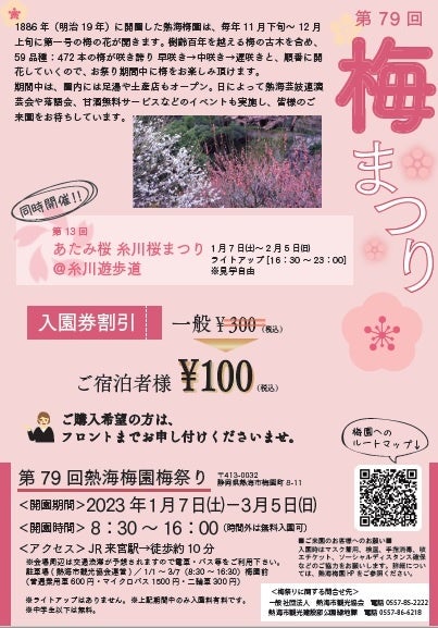 尚、熱海梅園のチケットは期間中当館フロントにて100円(通常一般300円)で販売しており、該当プラン以外でもご宿泊の際にご購入いただけます。梅まつりに参加される予定の方はこちらもぜひご利用ください。