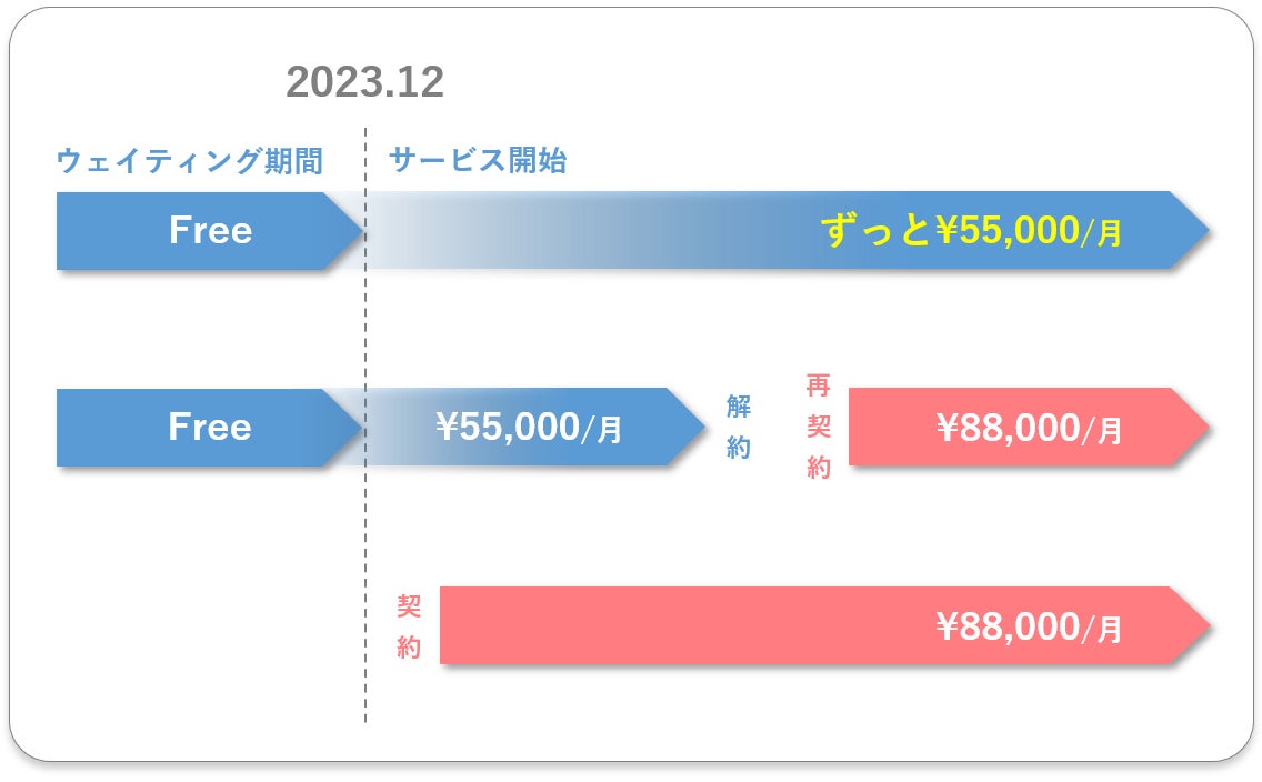 ウェイティング登録後、正式入会いただいた場合のみ、通常月額会費88,000円(税込)のところ、特別月額会費55,000円(税込)の特別料金となります。特別料金は退会するまで適用されます。