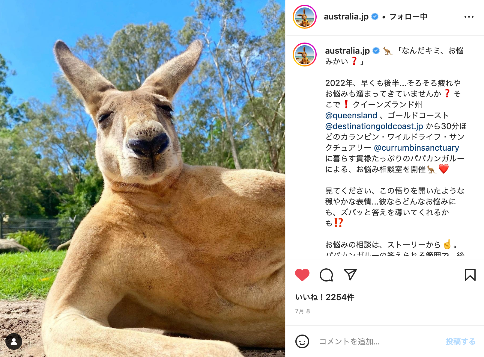 昨年の投稿の中で第1位に輝いたのは、人気ビーチリゾート、ゴールドコーストのカランビン・ワイルドライフ・サンクチュアリーで暮らしているパパカンガルー。まるでマッチョなダンディーのように人間味溢れる雰囲気を醸し出しているその逞しい姿が大ウケしたのですが、そんな彼へのお悩み相談企画を開催したところ、何と100件近くのお悩みが寄せられる結果となりました。クスッと笑える動物の姿に癒される人が続出していることもありますが、多くの方がカンガルーに相談したくなるほど様々な悩みを抱えていたのかもしれません。今年は、そんな皆さんの悩みが少しでも減りますように。