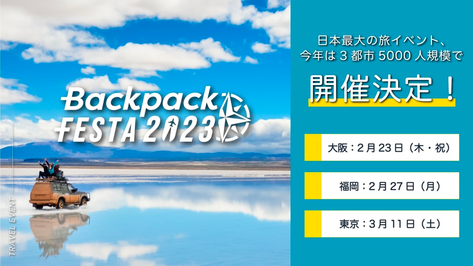 株式会社TABIPPO(東京都渋谷区 / 代表取締役社長 清水直哉)は、全国の若者が集まる日本最大級の旅イベント「BackpackFESTA2023」を開催いたします。本イベントは13回目の開催を迎え、今回は大阪・福岡・東京の3都市で行います。