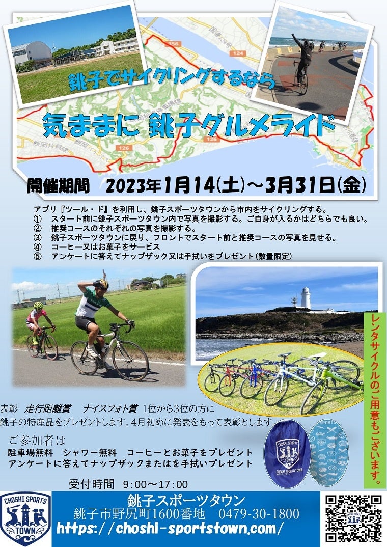 気ままに銚子グルメライドは スポーツ×地域活性化イベントです。銚子スポーツタウンからサイクリングで銚子観光して頂き銚子スポーツタウンまで戻って来て頂くとプレゼントを差し上げる 参加費無料のイベントです。