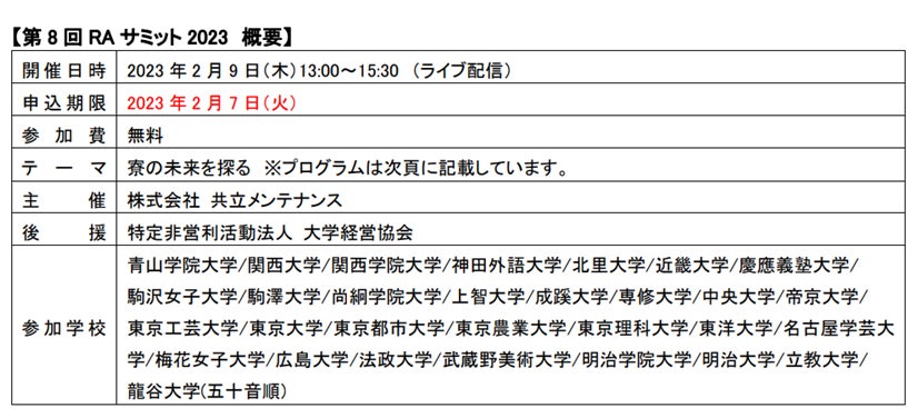 日本全国で約 1,300 校の学校法人と提携し学生寮を展開する株式会社 共立メンテナンス(以下、共立メンテナンス/代表取締役社長:中村幸治/本社:東京都千代田区)は、全国のドーミーに暮らす30大学39寮の現役学生が理想の寮づくりに向けて、日々取り組んでいる活動について発表を行う「第8回RA(レジデント・アシスタント)サミット2023」を、2023年2月9日(木)にライブ配信にて開催いたします。