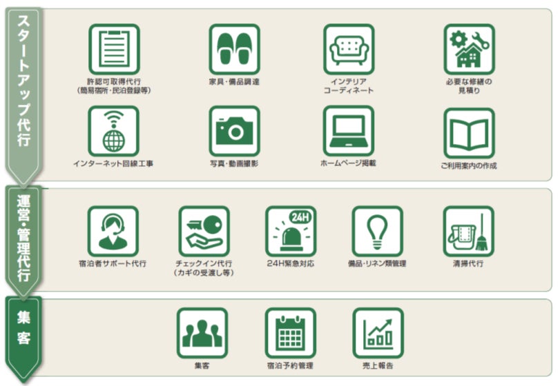 リソルステイは、別荘を宿泊事業に活用するオーナー様に向けて、運営に必要なあらゆるサービスをワンストップ(一元管理)で提供しています。サービスの提供を通じて、オーナー様の負担軽減、収益最大化を図ると同時に、宿泊者の満足度向上を実現しています。