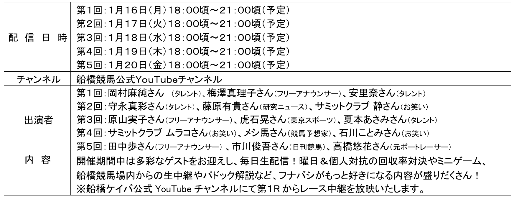 船橋競馬では、令和4年度第10回船橋競馬〔令和5年1月16日(月)~1月20日(金)〕について、新型コロナウイルス感染拡大防止対策を講じた上で、滞留人数3,000人(うち特別観覧席166人)までの有観客開催となります。場内イベントのお知らせは、次頁以降に詳細を記載しておりますのでご覧ください。また、入場および施設の利用につきましては、「令和4年度第10回から第12回までの船橋競馬の入場について」(https://blog.f-keiba.com/info/2023/01/post-e1f3.html)をご確認ください。