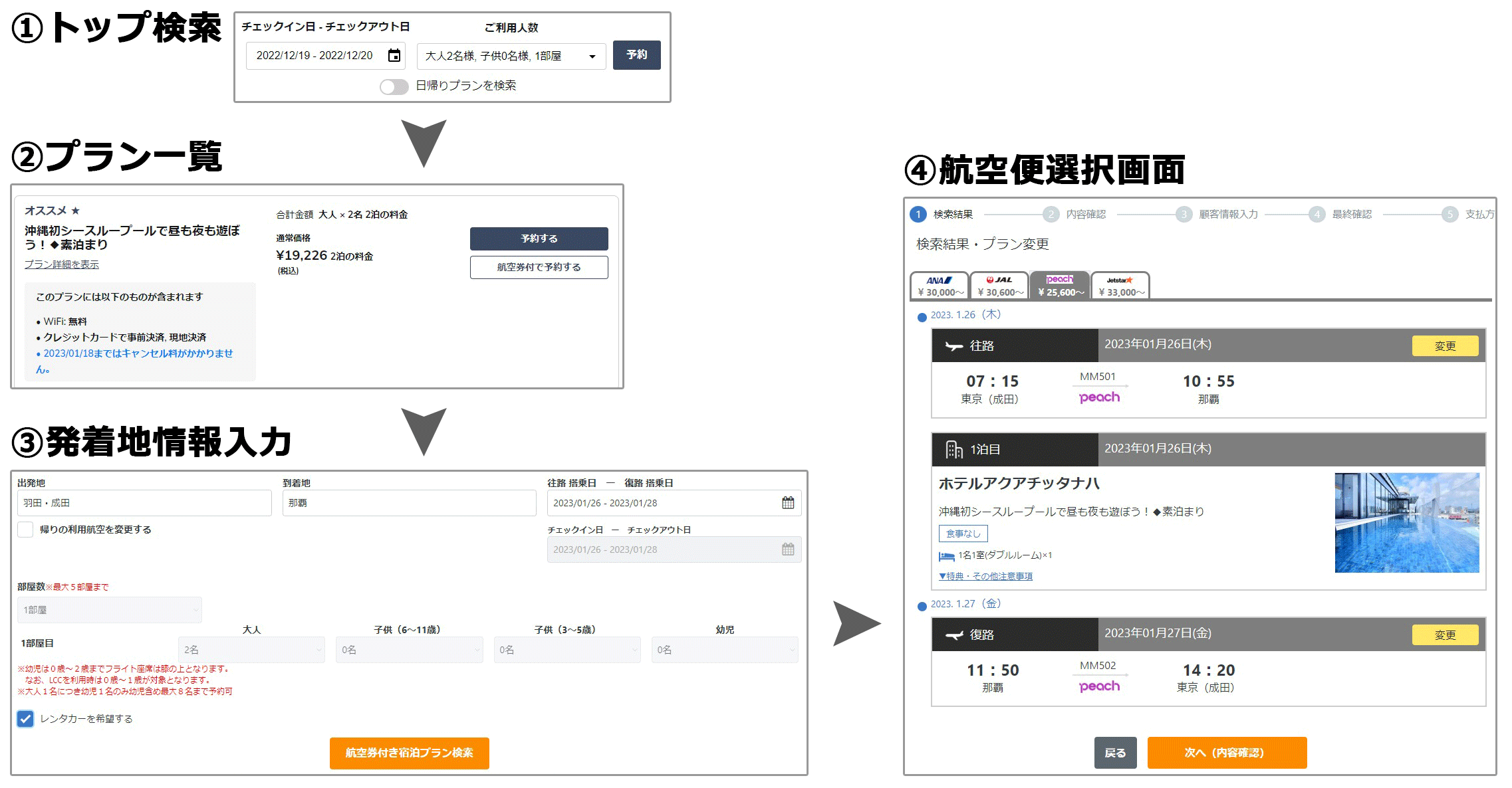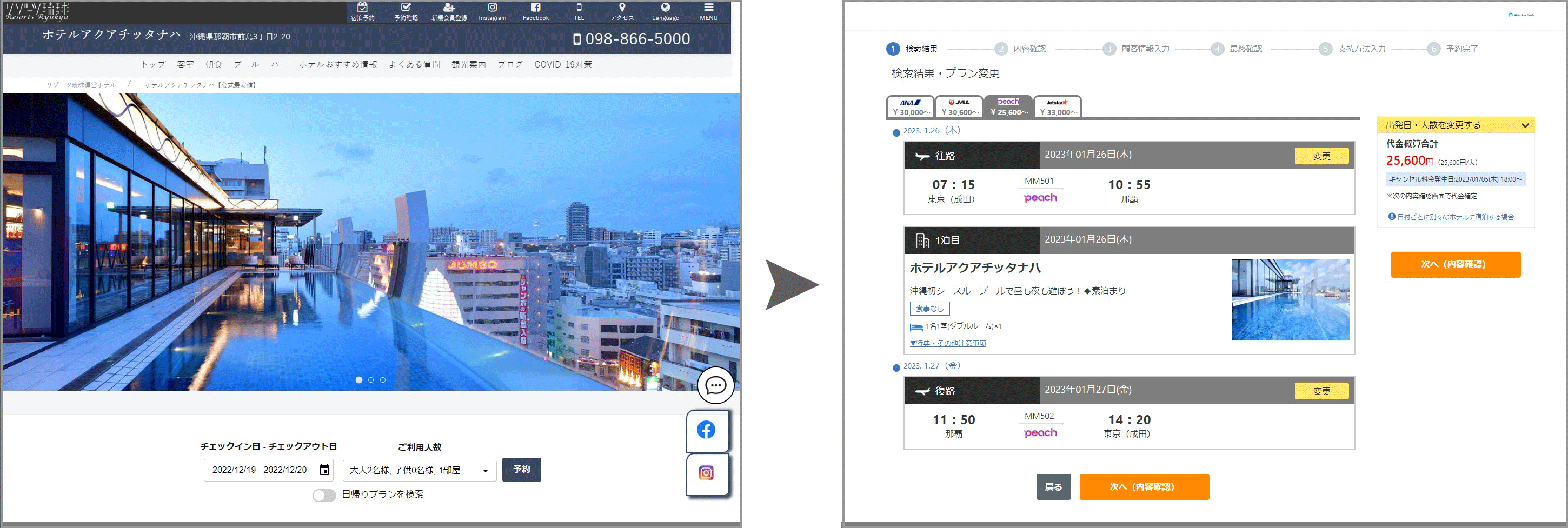 一方で、飛行機を伴う宿泊においては、パッケージツアー向けの運賃が航空券のみの運賃より安価に設定されていることが多く、公式サイトが航空券付きのパッケージツアーを販売できないことで、宿泊客を逃してしまうという課題がありました。