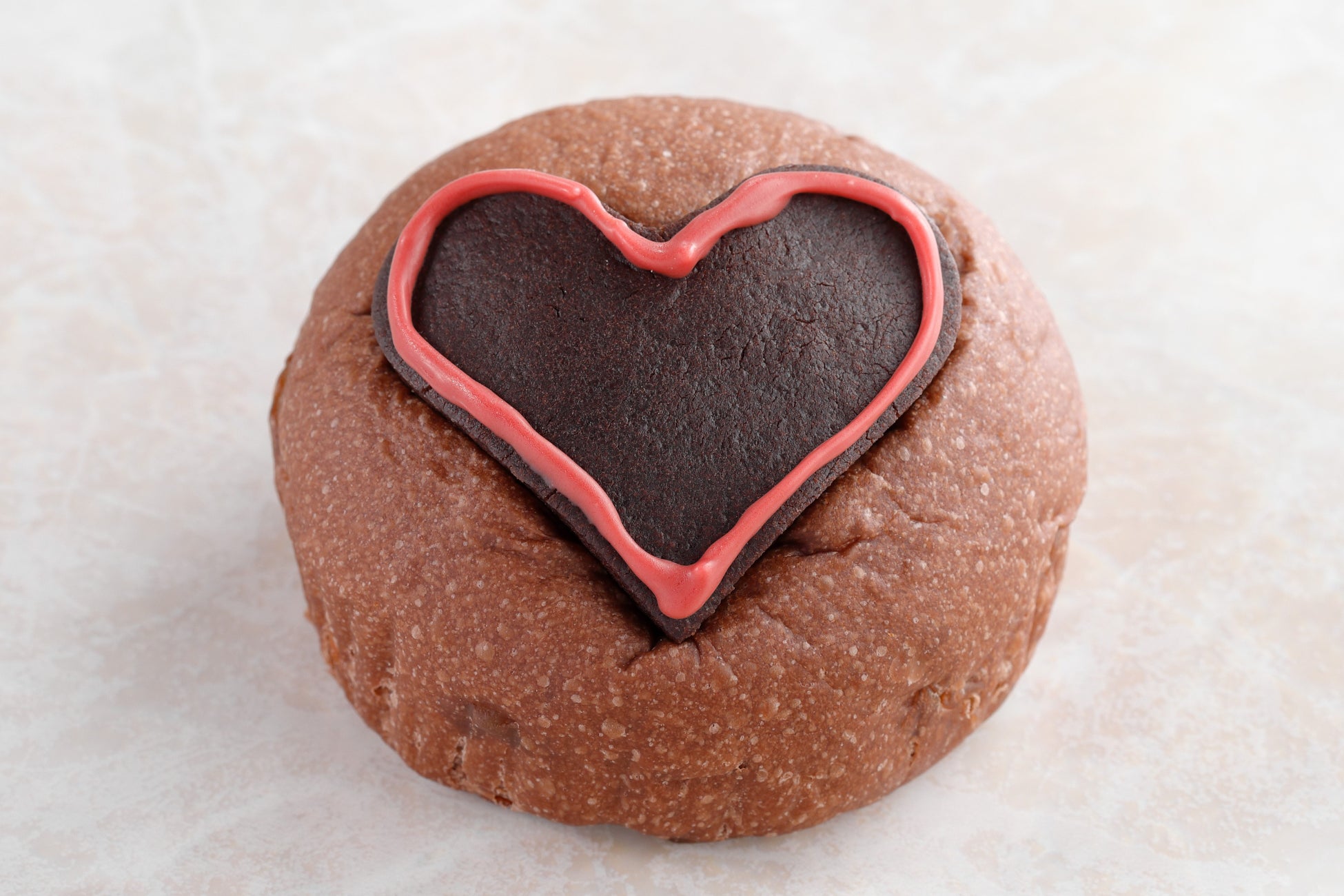 オレンジピールを練り込んだココア生地の中にチョコレートクリームをたっぷり詰め、ハート形のクッキーを乗せて焼き上げました。