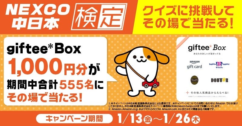NEXCO中日本は、公式Twitter「みちのつぶやき~NEXCO中日本~」で、クイズに挑戦して正解すると1,000円分のデジタルギフトが抽選で555名にその場で当たる『NEXCO中日本検定』キャンペーンを1月13日(金)から実施します。