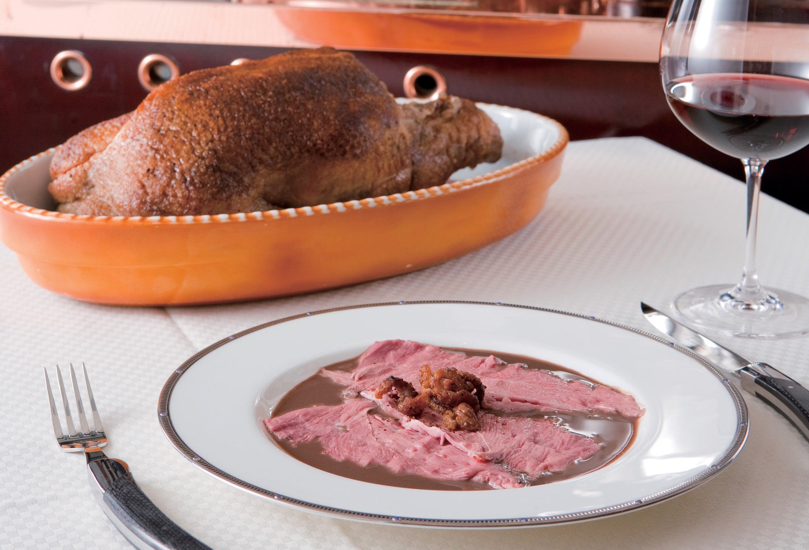一般的な鴨料理に使う鴨は血抜きをして食肉処理をしますが、今回ご用意するのは血抜きをせずにエトフェ(窒息)させた鴨です。窒息させることで血が体内に留まり肉が赤身を帯び、より風味が高まり身質は柔らかくなります。この鴨を丸ごとローストして捌いた後に、ガラをプレス機に入れてエキスを絞りソースに加えて仕上げます。鴨の風味を最大限に生かし、濃厚な香りと繊細な旨みを堪能できる「カナール・オ・サン」は19世紀末にパリのレストランから広まったフランスの伝統料理です。