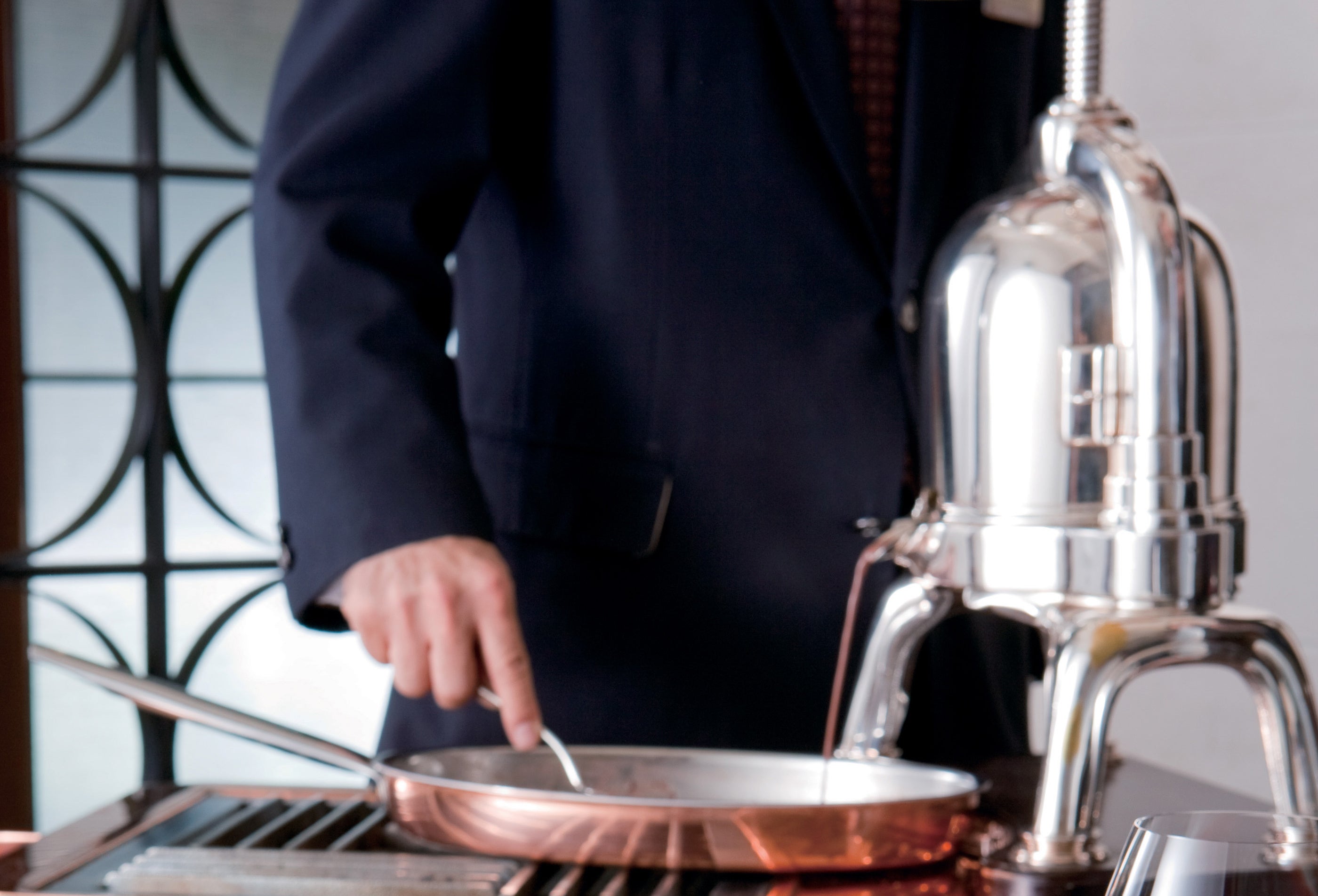 お客さまの目の前でお料理を切り分け、盛り付けやソースなどの仕上げを行う、本場フランス流のワゴンサービスです。