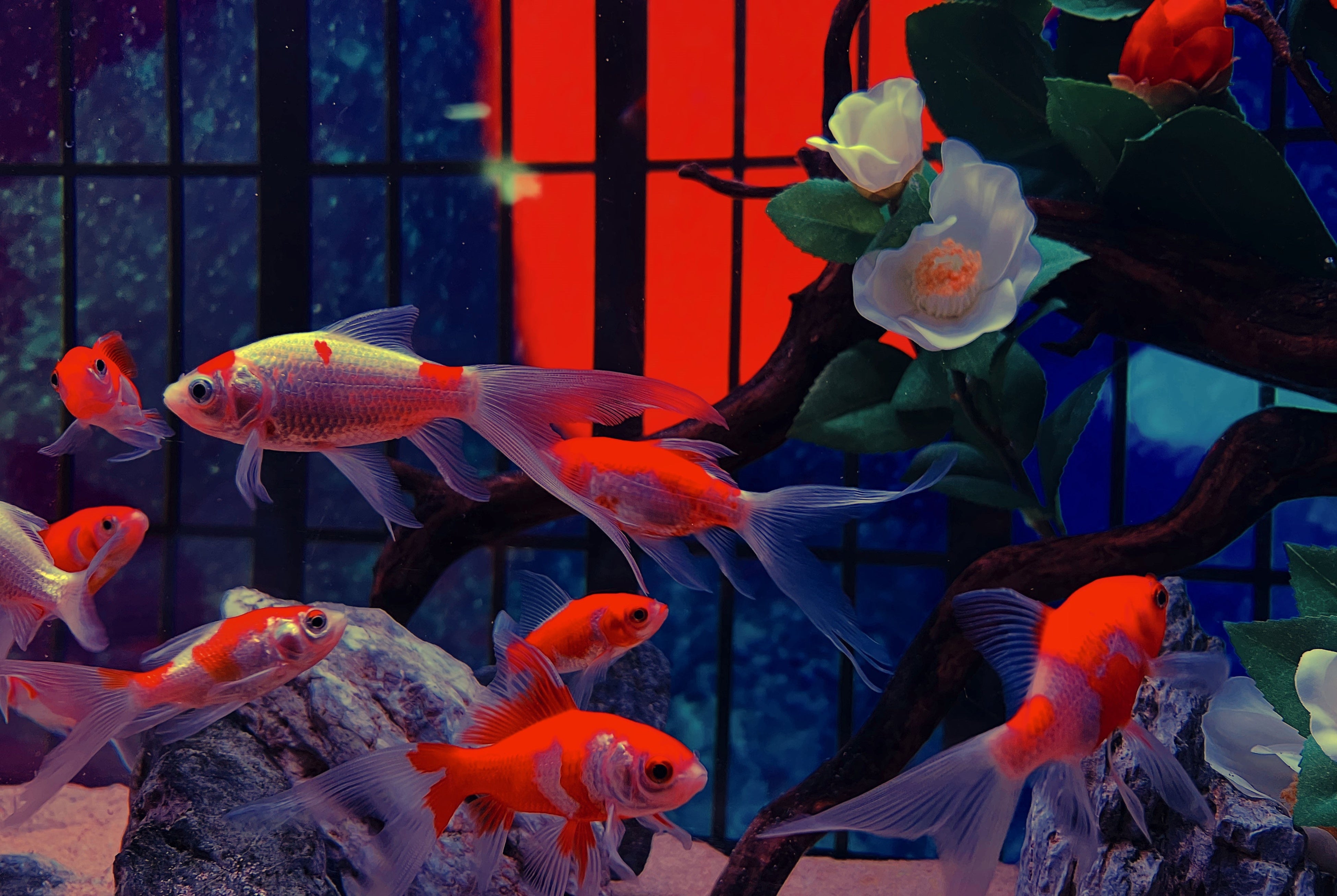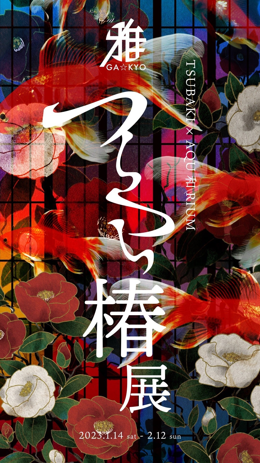今回の展示では、代表的な赤の椿に加え白の椿の造花を装飾し、その紅白の彩はまるで金魚を連想させます。葉と葉の間から椿の花が連なって咲いているように見える様子を表現した言葉「つらつら」、そんな金魚と椿の織りなす空間を是非お楽しみください。