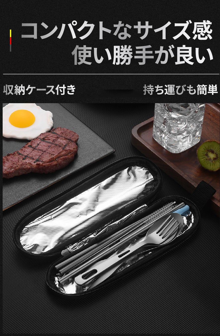 | セット内容 | ナイフ×1、スプーン×1、フォーク×1、箸×1、スプーンフォーク×1、ストロー×1、クロス×1、携帯用ケース×1、 |