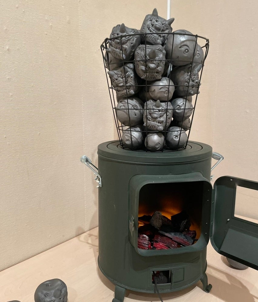 ▲サウナストーブ上に展示された菊間瓦製サウナストーン「鬼丸・鬼玉」