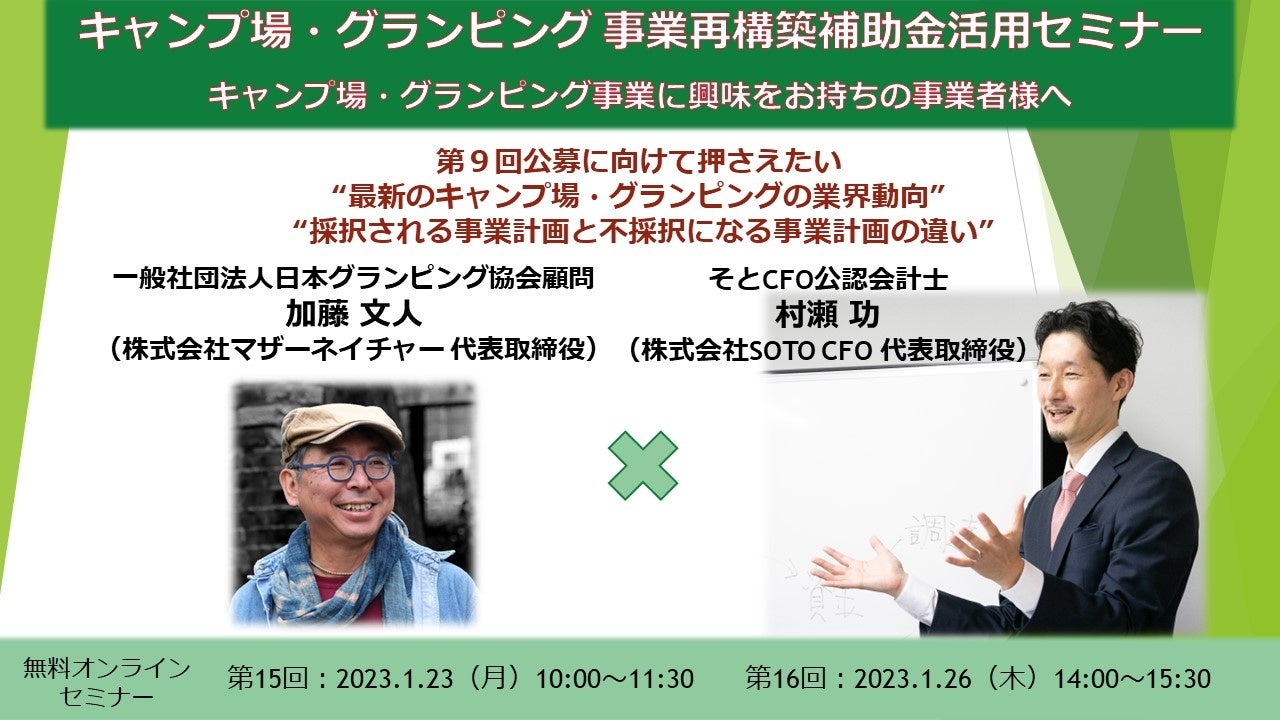 「事業再構築補助金を活用して新規事業としてキャンプ場・グランピング事業を提案する」無料のWebセミナー第15回・第16回を開催いたします。